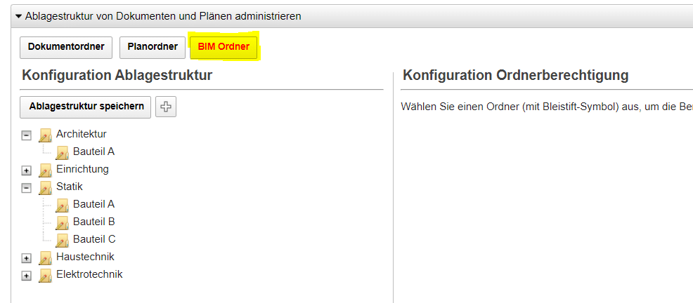 So wurde u.a. die Ordneradministration um das Modul BIM-Modelle erweitert. Die Funktionalität und Arbeitsweise sind die gleichen wie bei Dokumenten und Plänen.